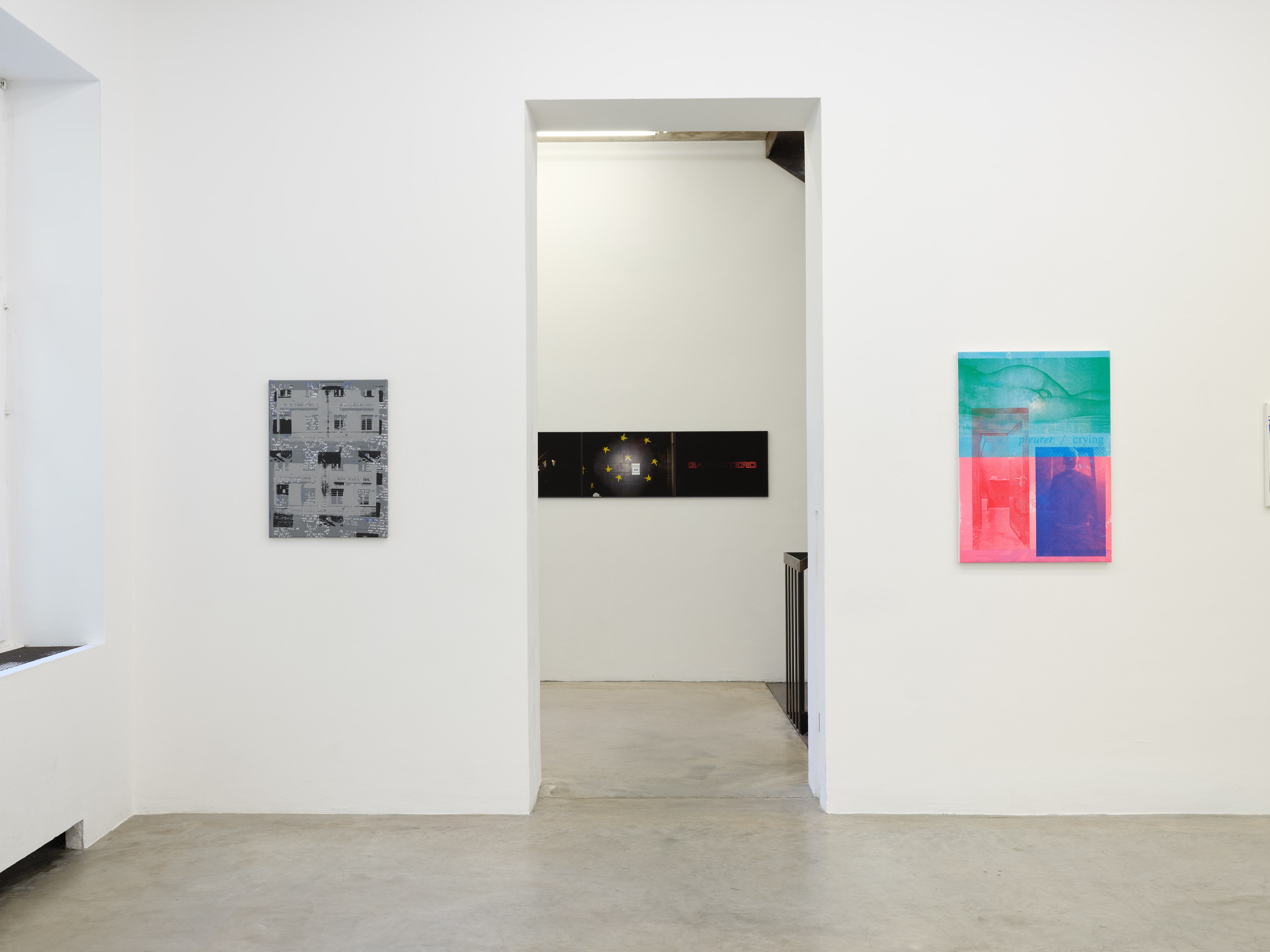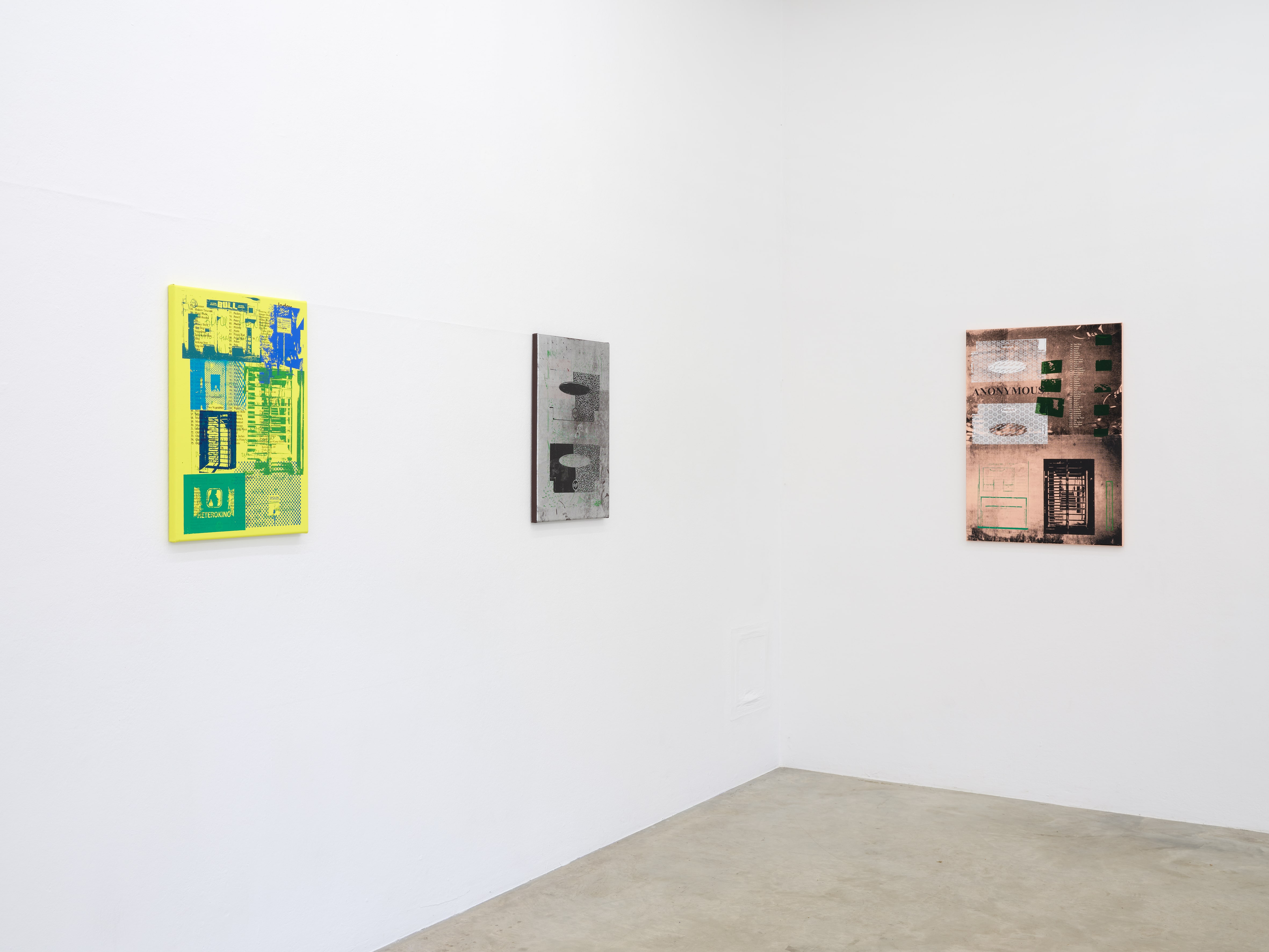 Exploring this idea further, the artist began work on the fragments series right afterwards. Leaving the idea of connecting the dots behind, this recent series of works is less abstract. The fragments include screen-printed photographs from Sameshima’s archive, explicitly never repeating an image, except for the base images of the floor, and sometimes including chapter titles from Barthes’ A Lover’s Discourse. All of fragments start with two different base images of the floor of a porn theater, usually splattered with cum and the presence of the artist’s own shoes, hence inscribing himself in every work. Mostly from his own archive, as in photographs or polaroids, but from altered image sources such as screenshots of amateur porn as well, thus forming patterns, Sameshima layers multiple images on top of each other, once more creating a dense collage of mostly pictorial information, that true to their title remain fragments nonetheless.