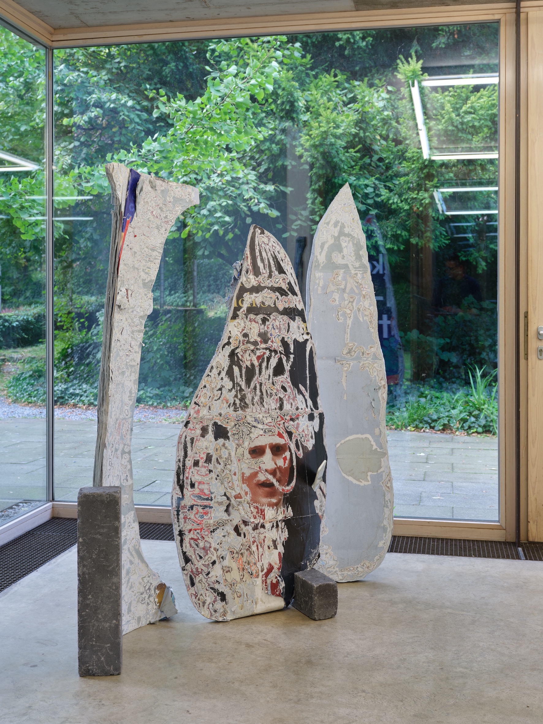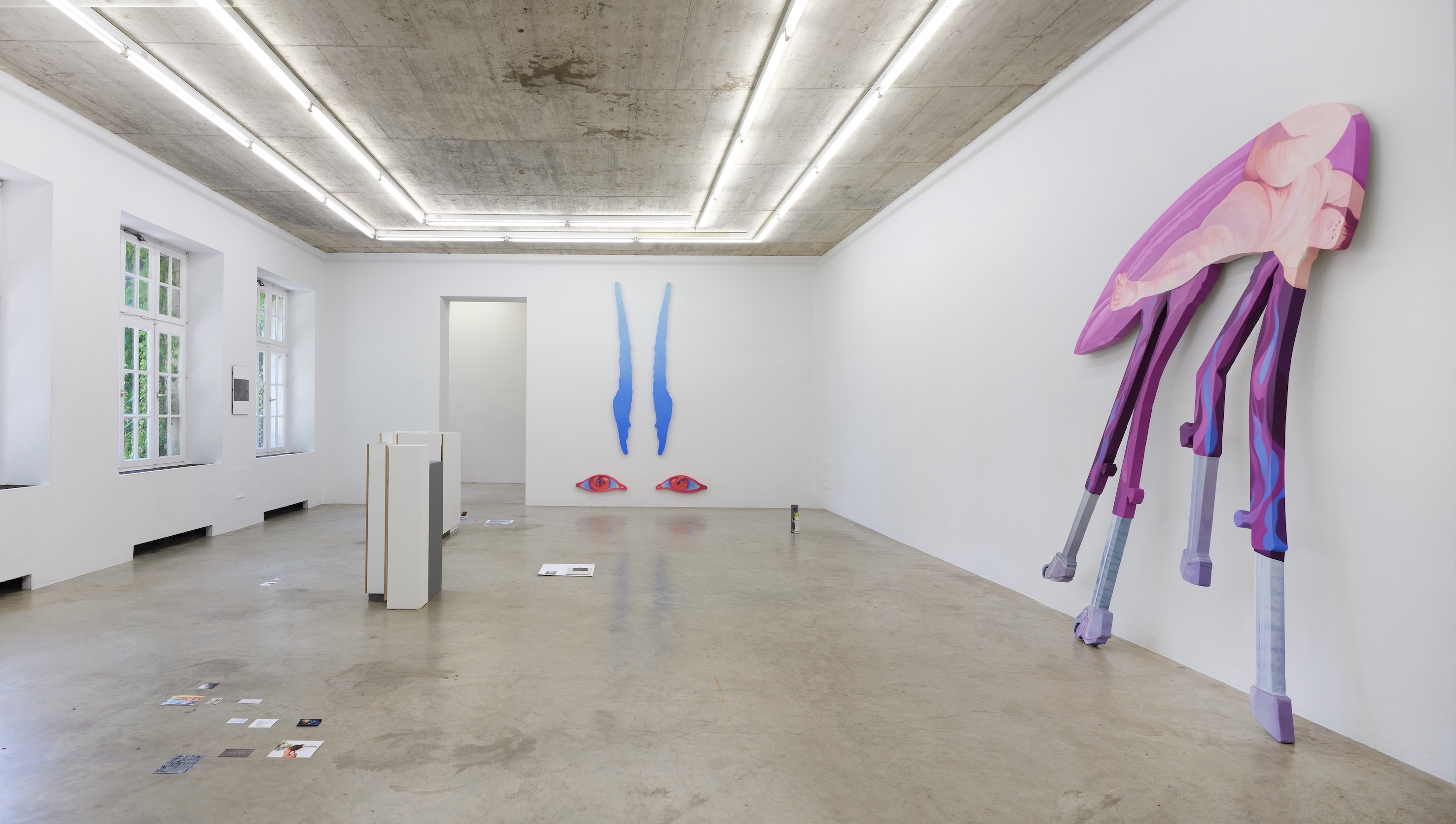 Thinking about layering can make the processes of creation and thematic overlaps tangible, as well as differences and gaps within the works. In the works, which range from figurative painting, photography, installations, sculptures, collages to video, these overlaps emerge as conceptual, material, temporal, and thematic strategies. The artists explore material layers – such as layers of posters in the sculptural works of Yaël Kempf, glazed layers of paint in the works of Julie Batteux, and paper collages by David Reiber Otálora – to layers of different logics in the works of Simon Wienk-Borgert. Engaging with multiple metaphorical layers through their motifs, the works open up complex art-historical references, personal memories, and connections between material, spaces and time, both within each work and in dialog with one another.