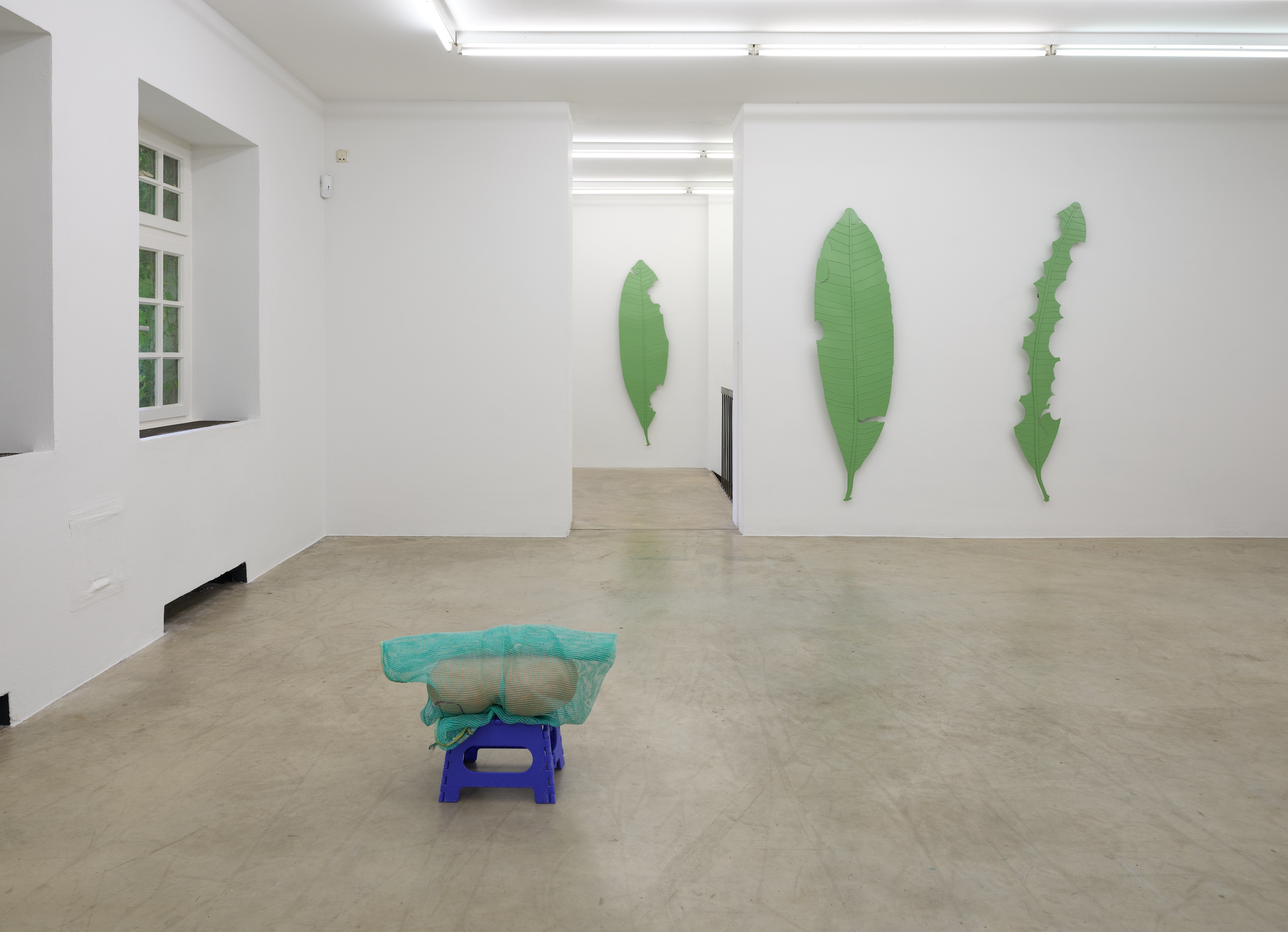 David Reiber Otálora‘s artistic work investigates the impacts of colonialism that continue to affect society today. He is particularly interested in the tropics, their exoticist representation and exploitation, but also in the question of how common Western perspectives can be questioned and expanded through new, alternative viewpoints. Green, oversized plant leaves made of metal hanging on the wall play with the Western tradition of using tropical plants and their motifs as purely decorative elements. The viewer’s gaze is directed to the form, the material, and the size of the leaf. But only the knowledge that this is an enlarged representation of real models from nature, showing damage caused by leafcutter ants whose colonies are mainly found in the South American rainforest, opens up another dimension of the work. Reiber Otálora is interested in the production aesthetics of nature, as shown in the cutting traces of the ants on the leaves. The decision-making process of these insects resembles Reiber Otálora’s artistic approach, especially in his collages, which can be seen on the first floor of the exhibition. Here he processes copies of scientific text excerpts and schematic drawings from essays like Plant chimeras: The good, the bad, and the ‘Bizzaria’ (Margaret H. Frank, Daniel H. Chitwood, 2016) as well as photographs from online forums dealing with the technique of plant grafting – the joining of two plants so that they grow together. Reiber Otálora sews these materials into large-format collages. Similar to the botanical technique itself, multilayered image surfaces emerge: leaf elements are cut out – as by the ants -reveal other layers and join together to form new shapes that can be infinitely expanded.