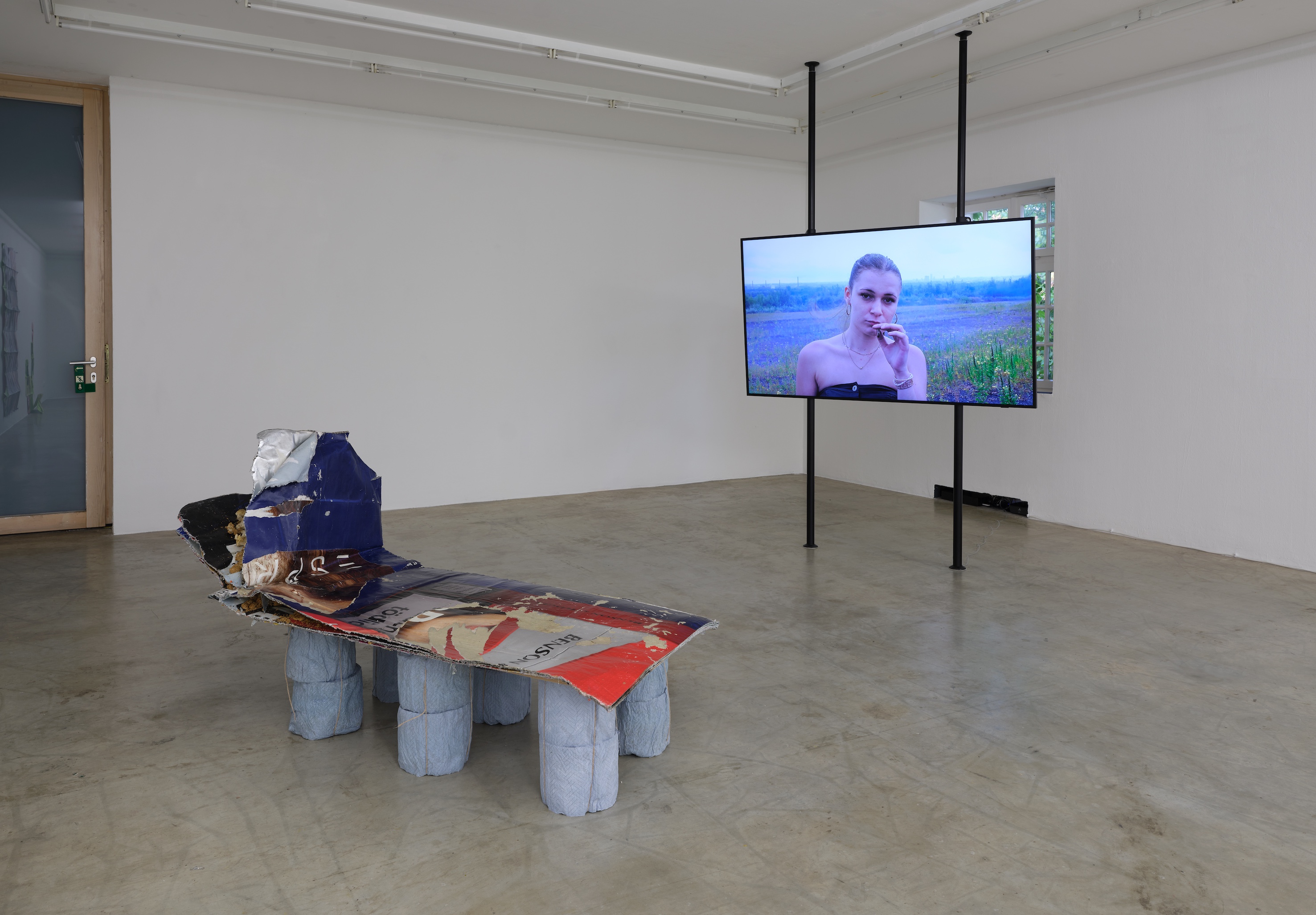In the foyer of the Kunstverein, visitors encounter the installation Problem of God by Yaël Kempf. The sculptures consist of thick layers of former poster walls found on the street, whose milled, bark-like surfaces reveal fragments of past advertising messages. These remnants of consumption and the urban landscape, detached from their original purpose, become raw sediments of a contemporary urbanity. Standing archaically in the space, the forms resemble sharply struck flint tools from the Stone Age. Between the layers, an iPhone is embedded, playing a video that refers to the film on the upper floor, in which the suggested narrative continues. There, a bench made of the same layered material invites visitors to linger. Mushrooms grow from it, like on a felled tree. It forms the starting point for the short film, in which mythical images meet a brittle, post-industrial urban landscape. Together with a group of young people from the Glückauf School in Essen, the video was created based on an improvised scene script that transforms their living environments and fantasies into poetic fictions. It was filmed on the grounds surrounding Richard Serra’s monumental sculpture Bramme, located on a former mining dump in the north of Essen. The relic of a coal mining becomes the backdrop for their story. In wide shots, the young people run over huge pipelines, the camera movements are reminiscent of the free dynamics of open video game worlds. In other scenes, they play soccer, filmed from a player’s perspective, so that the boundary between digital aesthetics and real presence oscillates. A feeling of summer, youth, freedom, and inertia emerges, interspersed with thoughts of the future. Scenes merge into a state of lightness and uncertainty. Violence, crime, and unspoken desires flash up – the young people drift between past, present, and new possibilities