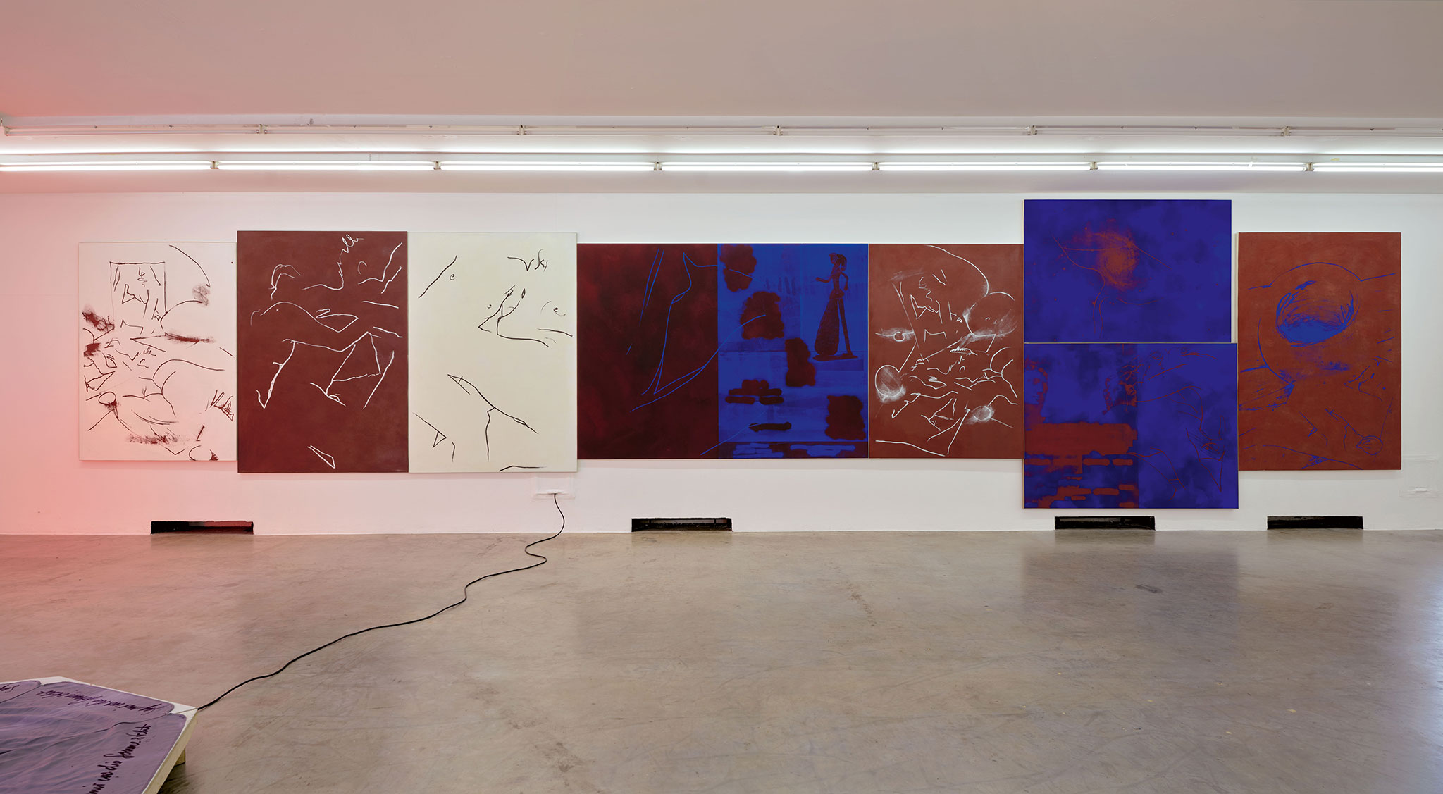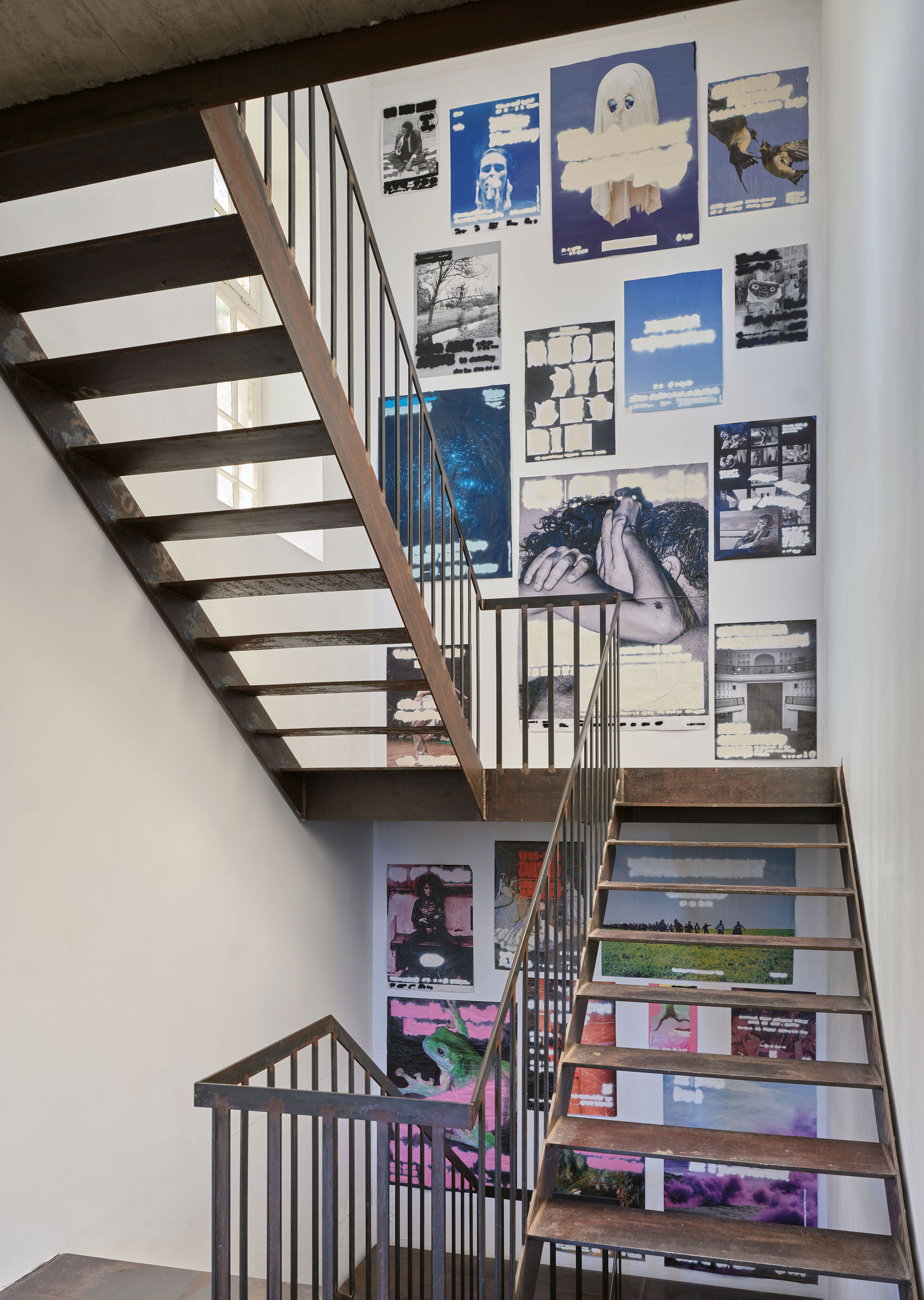 Im Treppenhaus wird durch die jüngste Edition des Anarchive (2023-26) die Frage nach Öffentlichkeit nochmal aufgegriffen – nun allerdings in ihrer Negation. Paint trifft Poster, durch das Übersprühen der Textelemente wird Ausstellungsplakaten ihre Mitteilungsfunktion entzogen und sie zu rein visuellen Gebilden umgewandelt, Deleten als malerische Geste.