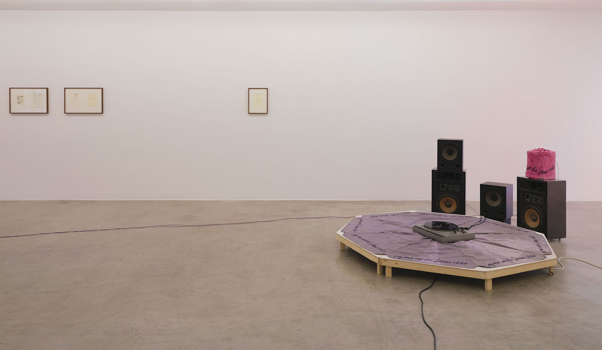 Die sich in der Ausstellung vielfältig überlagernden Rhythmen und Temporalitäten werden hier darüber hinaus ins Akustische ausgedehnt: eine Dubplate des Hamburger Musikers Block Barley läuft im Dauerloop. Über das hörbare, regelmäßige An- und Auslaufen der Platte werden nicht zuletzt Medium und Wahrnehmung noch mal selbst reflektiert: Übergang von der Materialität des Trägers zu einer Semantik des Klangs, Wahrnehmung erscheint hier ein weiteres Mal als prozessual, nicht objektzentriert, das Ästhetische als Grenzzustand und Relation statt als fixes Objekt. Nur konsequent, dass mit einer zweiten Neonarbeit ein weiteres Mal die Sonne aufgeht: morgens endet nie.