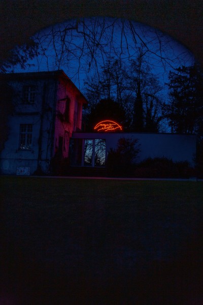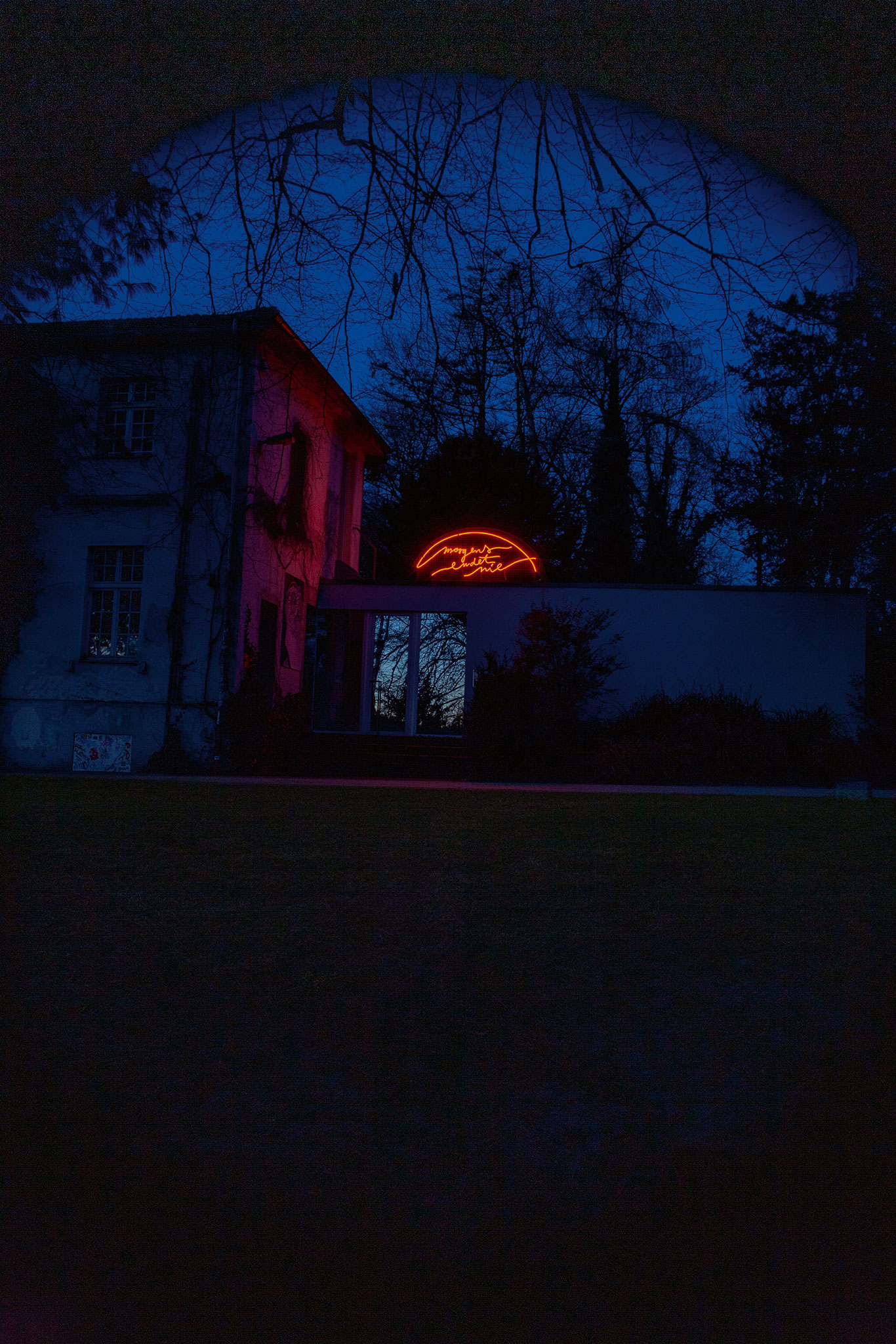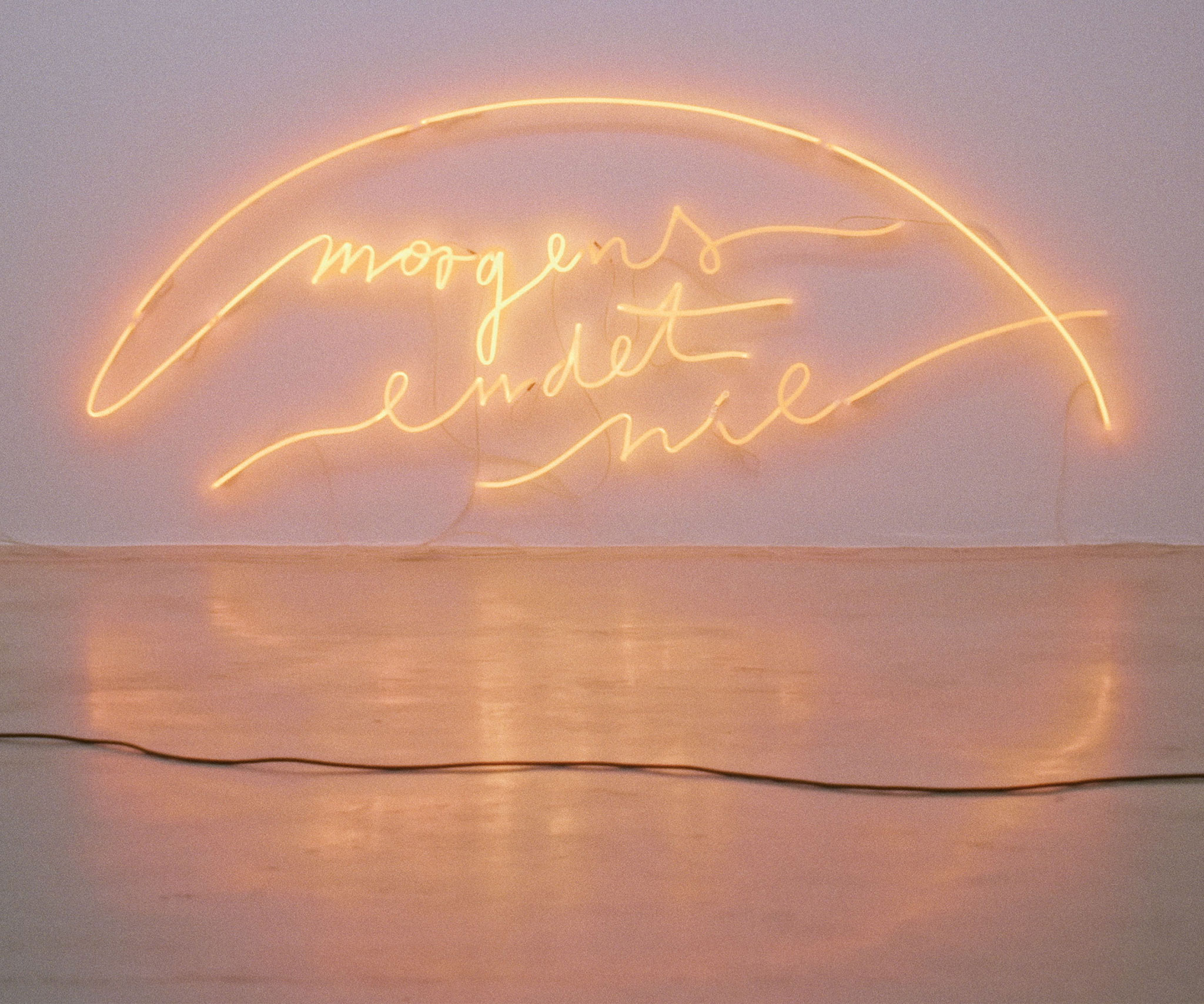 Der Beginn der Ausstellung wird durch eine programmatische Setzung an der Außenfassade des NAK markiert, der bewusst auf der Schwelle von Umwelt und Ausstellungsraum angebrachten Neonarbeit morgens endet nie (2026). Mit ihr wird die menschliche Perspektive ins Verhältnis zu einer planetaren gesetzt und eine nicht-anthropozentrische Sicht auf Zeit aufgerufen: Der Morgen als lokaler Effekt eines kosmischen Rhythmus, als immer nur regionale Zuschreibung eines ununterbrochenen Zyklus.